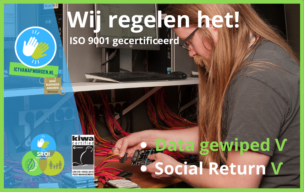 Wanneer je maatschappelijk verantwoord onderneemt of vanuit een Social Return verplichting er voor kiest om je afgeschreven hardware aan ICT vanaf Morgen af te staan voeren wij het data wipen kosteloos uit. Sterker, we halen al je afgeschreven hardware gratis op. Dus ook hardware dat niet voor refurbishment in aanmerking komt (deze voeren wij verantwoord af zodat nog zoveel mogelijk onderdelen kunnen worden hergebruikt).