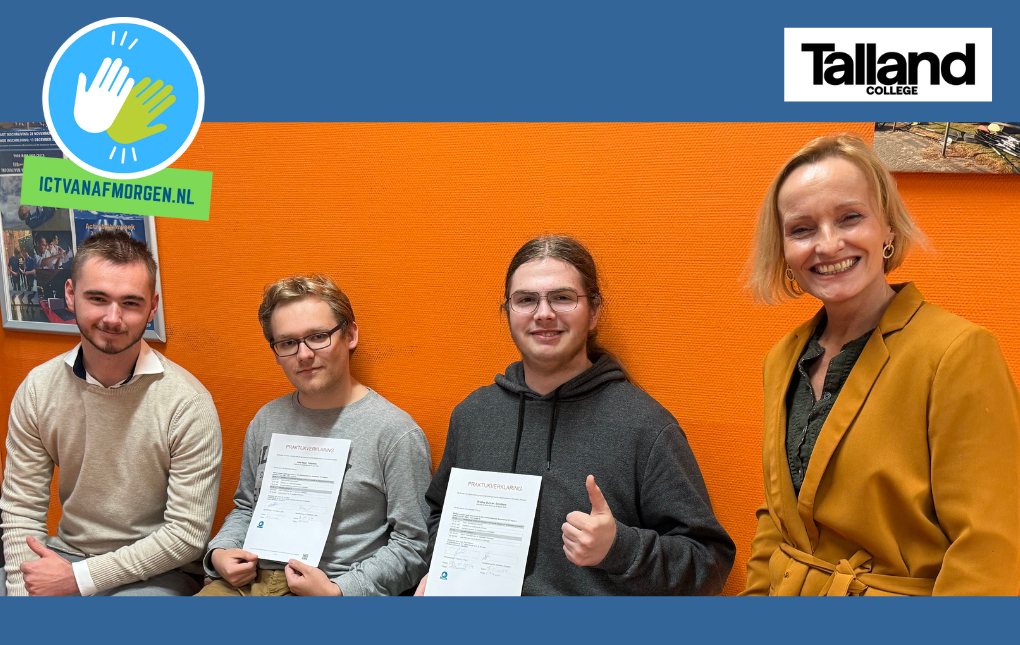 Een mijlpaal om te vieren: Bradley en Jelle hebben hun MBO2-Praktijkverklaring Medewerker ICT Support behaald! Beide ontvingen deze uit handen van Dynke Valkenburg van het Talland College. Jelle, 2e van links op de foto, draait al bijna een jaar mee bij ons en Bradley, rechts van hem, sinds een half jaar. Beide hebben ze hard gewerkt, geleerd en zichzelf ontwikkeld op de werkvloer. En nu? Nu zetten ze de volgende stap en starten ze met onze nieuwe MBO3-opleiding IT System & Devices.
